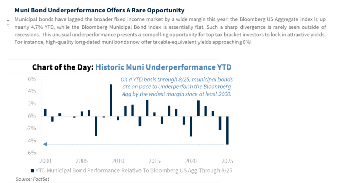 Bottom line, they have underperformed taxable bonds this year. Despite recent underperformance, municipal bonds remain compelling for high income earners due to their tax-equivalent yields and exemption from federal income tax.