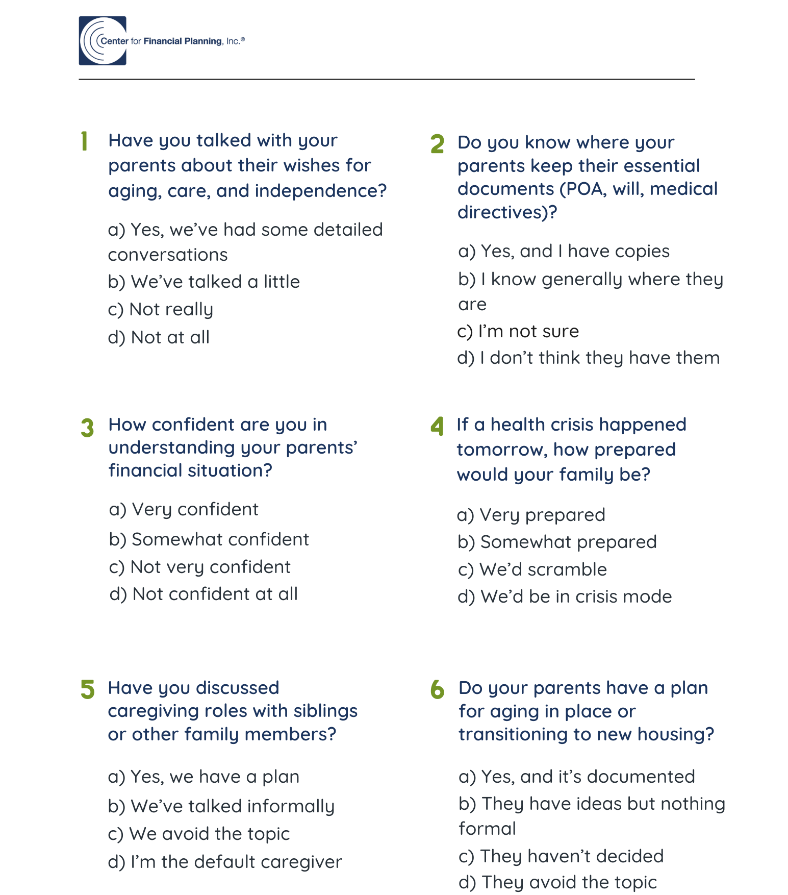 Take this short quiz to see how prepared your family may be for future caregiving, financial decisions, and important planning conversations.